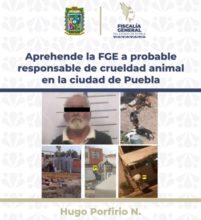 La Fiscalía General del Estado de Puebla dio cumplimiento a una orden de aprehensión en contra de Hugo Porfirio N., de 73 años de edad, por su probable responsabilidad en delitos contra los animales mediante actos de crueldad.
