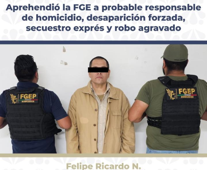 La Fiscalía General del Estado dio cumplimiento a la orden de aprehensión en contra de Felipe Ricardo N., por su probable responsabilidad en los delitos de homicidio calificado, desaparición forzada de personas por particulares, secuestro exprés y robo agravado, en agravio de cinco jóvenes, cuatro hombres y una mujer, ocurrido en el municipio de Libres, Puebla.