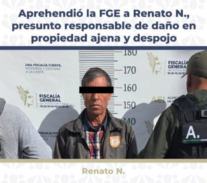 La Fiscalía General del Estado de Puebla informa que se dio cumplimiento a una orden de aprehensión en contra de Renato N., por su probable responsabilidad en los delitos de daño en propiedad ajena y despojo agravado.