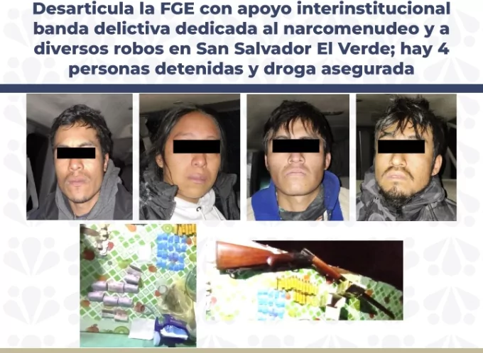 La Fiscalía General del Estado (FGE), en coordinación con la Secretaría de la Defensa Nacional (DEFENSA) y la Secretaría de Seguridad Pública Estatal (SSPE) desarticuló en el municipio de San Salvador El Verde, banda delictiva dedicada al narcomenudeo y robos en distintas modalidades.