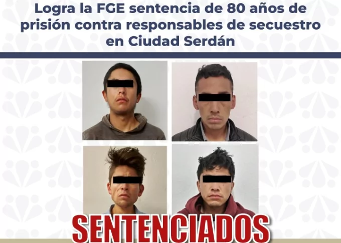 La Fiscalía General del Estado de Puebla obtuvo sentencia condenatoria de 80 años de prisión en contra de Jonathan N., Pedro N., Antonio de Jesús N. y Luis Damián N., como responsables del delito de secuestro agravado cometido en agravio de un hombre, en el municipio de Ciudad Serdán, Puebla.