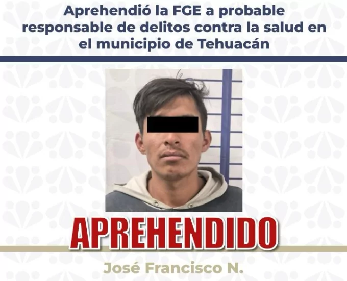 La Fiscalía General del Estado dio cumplimiento a la orden de aprehensión en contra de José Francisco N. alias “EL Pancho”, de 24 años de edad, por su probable responsabilidad por delitos contra la salud en su modalidad de posesión simple de metanfetamina, ocurrido en el municipio de Tehuacán, Puebla.