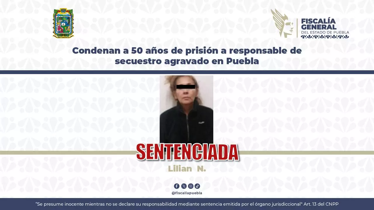 La Fiscalía General del Estado de Puebla (FGE) obtuvo sentencia condenatoria contra Lilian N.,