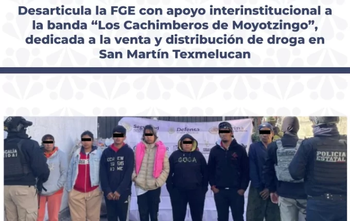 La Fiscalía General del Estado encabezó un operativo interinstitucional con apoyo de la Secretaría de la Defensa Nacional (DEFENSA) y la Secretaría de Seguridad Pública Estatal (SSPE), que dio como resultado la desarticulación de la banda de “Los Cachimberos de Moyotzingo”, integrada por siete personas presuntamente dedicadas desde hace varios años a la venta y distribución de estupefacientes en la región de San Martín Texmelucan.