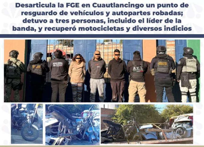 Como parte de las acciones contra el robo de vehículos, la Fiscalía General del Estado realizó un operativo interinstitucional de cateo en Cuautlancingo, Puebla, que derivó en el aseguramiento de un inmueble utilizado para el resguardo de unidades y autopartes de procedencia ilícita, la detención del presunto líder de la banda y dos cómplices, así como el aseguramiento de diversos indicios.