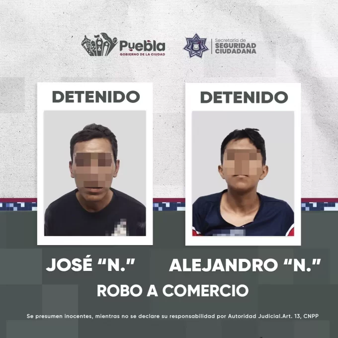 Puebla, Pue., 13 de octubre de 2025.- Como parte de las acciones para seguir Poniendo Orden y brindar protección a las y los habitantes, la Secretaría de Seguridad Ciudadana (SSC) en coordinación interinstitucional con el Ejército Mexicano (DEFENSA) y la Secretaría de Seguridad Pública del Estado (SSP), detuvo a dos hombres por su presunta participación en el delito de robo a comercio, una joyería, en calles del Centro Histórico.