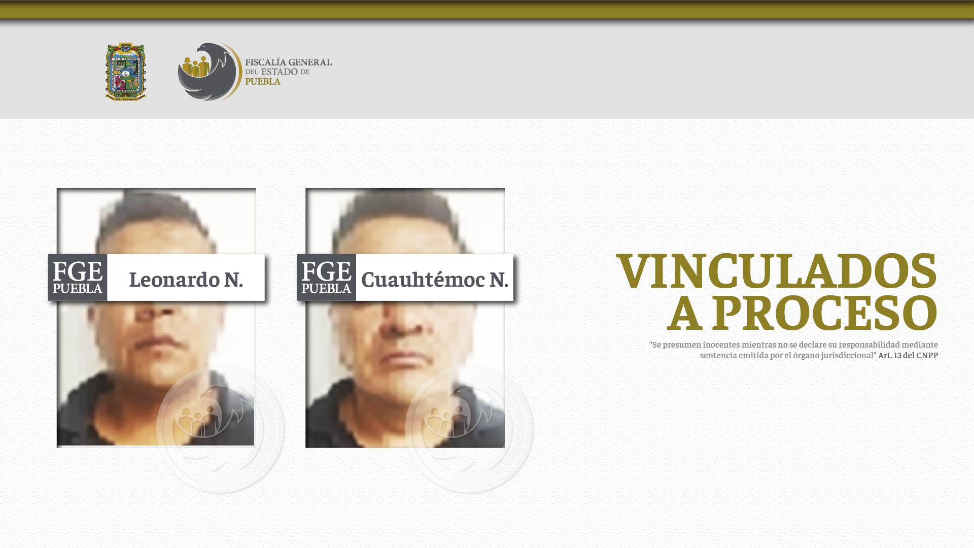 Por el delito de uso indebido de uniformes, la Fiscalía General del Estado de Puebla obtuvo la vinculación a proceso de Leonardo N. y Cuauhtémoc N., Bomberos de la Secretaría de Seguridad Pública del Estado.