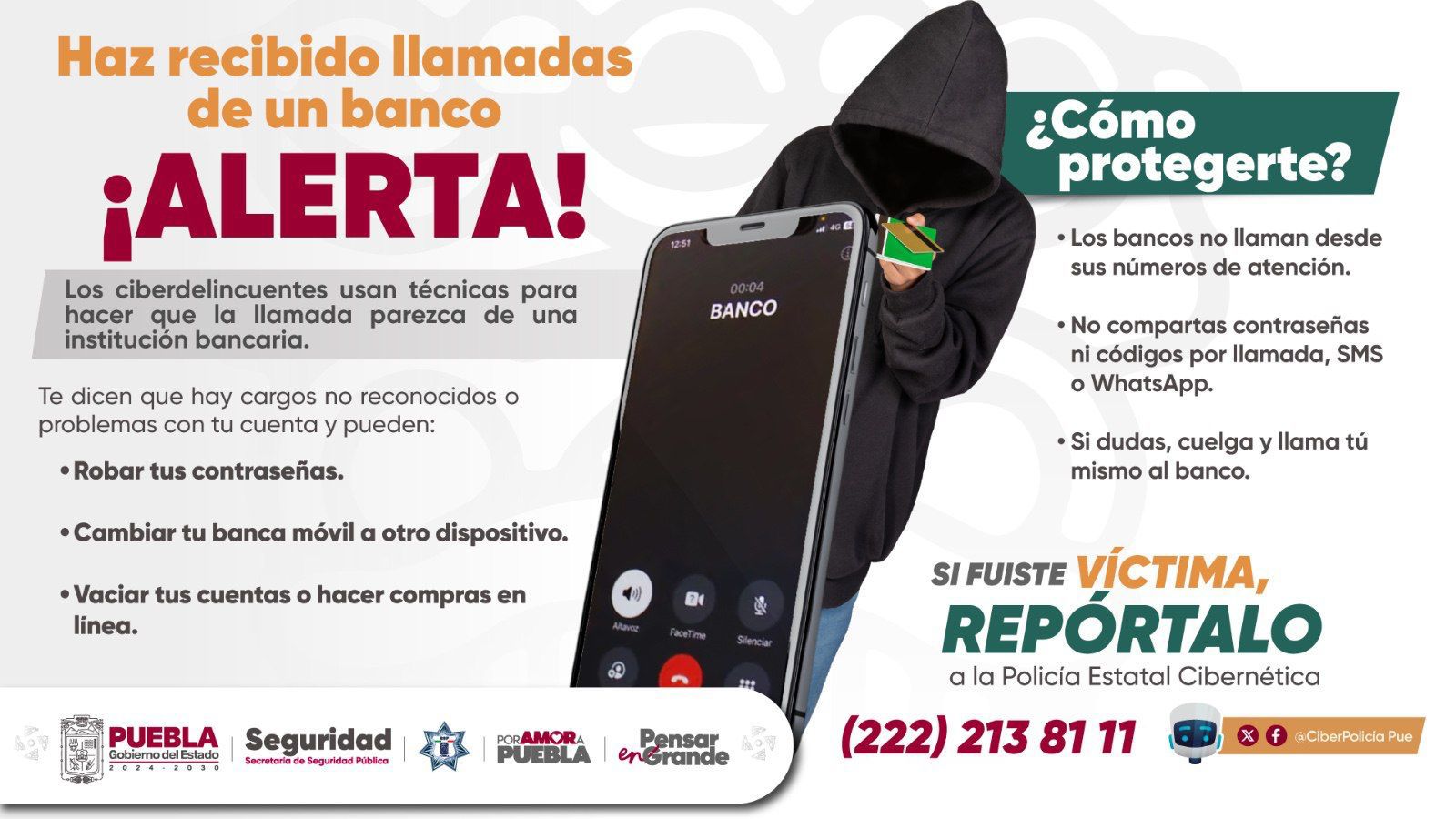 CIUDAD DE PUEBLA, Pue.- Con la finalidad de evitar que la población sea víctima de un delito cibernético, la Secretaría de Seguridad Pública (SSP) recomienda extremar precauciones al recibir llamadas telefónicas de supuestas instituciones bancarias.