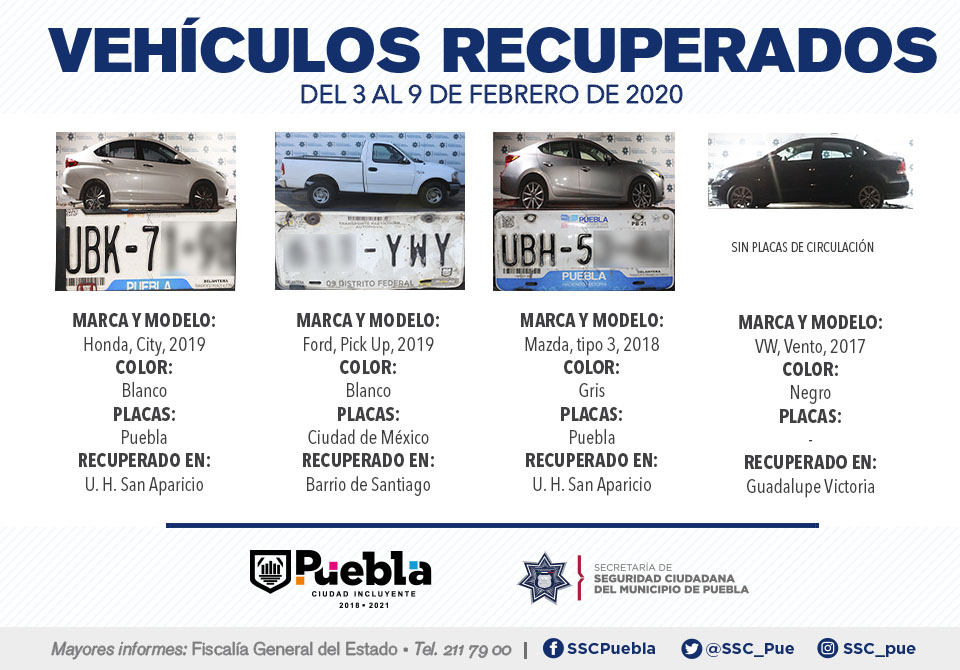 Derivado del fortalecimiento de esquemas de vigilancia en las tres regiones, nueve zonas y 271 vectores de proximidad, la Secretaría de Seguridad Ciudadana (SSC) de Puebla reportó la ubicación y remisión de 25 vehículos ante el Agente del Ministerio Público, en el periodo que comprende del 3 al 9 de febrero del presente año.