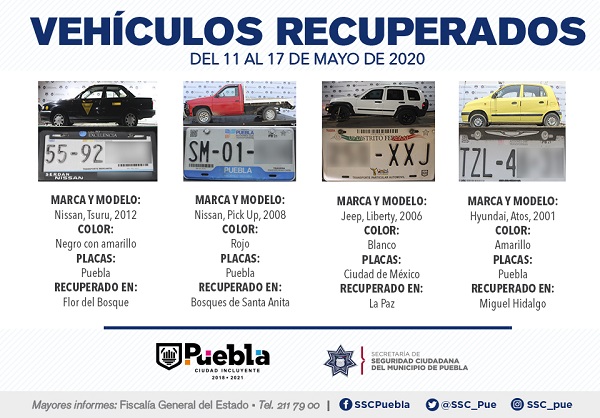 Como resultado de la ejecución de labores preventivas en colonias, unidades habitacionales, barrios y juntas auxiliares, la Secretaría de Seguridad Ciudadana (SSC) del Municipio de Puebla reportó la recuperación de 10 vehículos con reporte de robo, en el periodo que comprende del 11 al 17 de mayo del presente año.