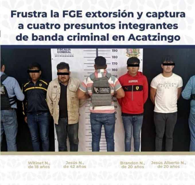 La Fiscalía General del Estado de Puebla informa que como resultado de labores de inteligencia y actuación oportuna, logró frustrar una extorsión y detener en flagrancia a cuatro presuntos integrantes de una célula delictiva que operaba en el municipio de Acatzingo.