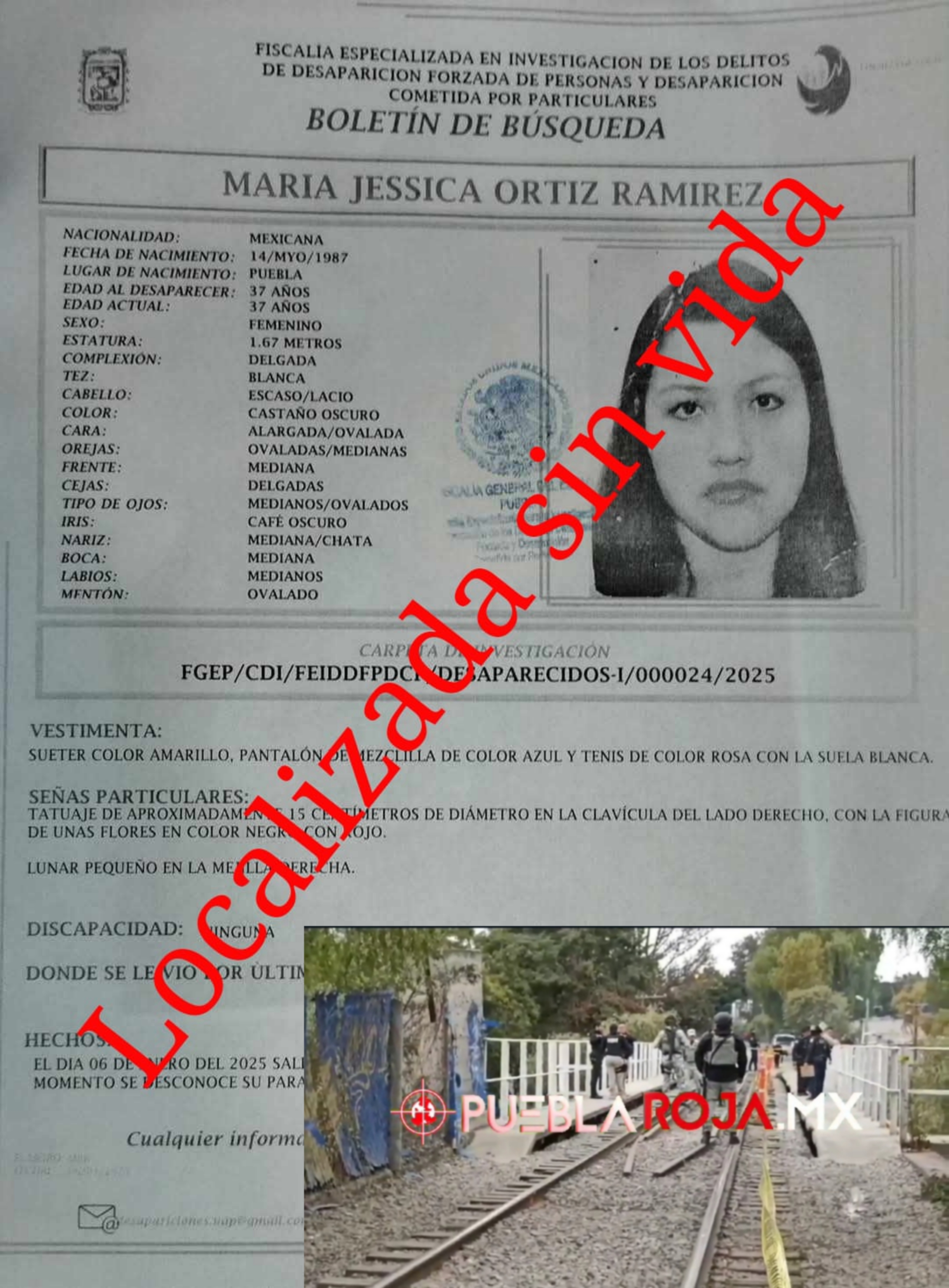 La búsqueda de María Jessica Ortiz Ramírez tuvo un trágico desenlace. La mujer de 37 años, reportada como desaparecida desde el pasado 6 de enero, fue localizada sin vida el domingo por la tarde en el río Atoyac, a la altura de las vías del tren en la junta auxiliar Ignacio Romero Vargas.
