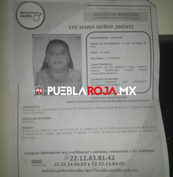 De acuerdo con información recabada de fuentes ciudadanas, la identificación se logró luego de que el jueves se difundiera la imagen del cadáver, lo que permitió que personas cercanas a la víctima la reconocieran y establecieran contacto con las autoridades. Con ello se confirmó que se trataba de Luz María, cuyo paradero era desconocido desde el 4 de febrero de 2026, fecha en la que salió de su domicilio ubicado en la junta auxiliar de San Francisco Totimehuacán, sin informar a dónde se dirigía.