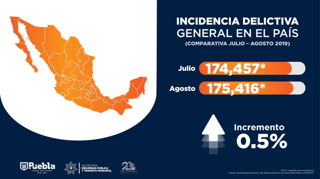 Incidencia delictiva en Puebla capital bajó 23.3 por ciento, revelan cifras del SESNSP (Gráficas)