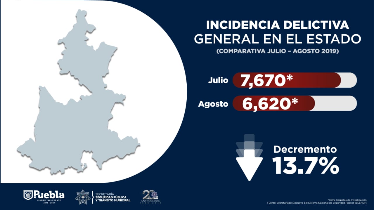 Incidencia delictiva en Puebla capital bajó 23.3 por ciento, revelan cifras del SESNSP (Gráficas)