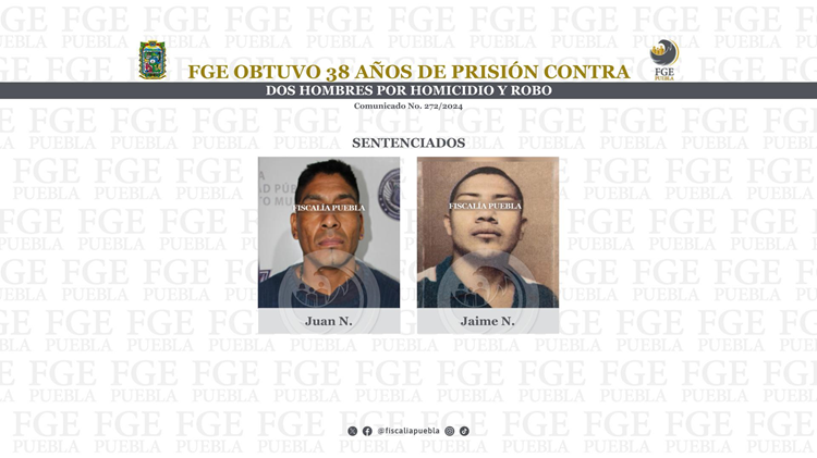 La Fiscalía General del Estado de Puebla obtuvo sentencia de 38 años de prisión contra Juan N. y Jaime N., penalmente responsables de los delitos de homicidio calificado y robo en grado de tentativa.