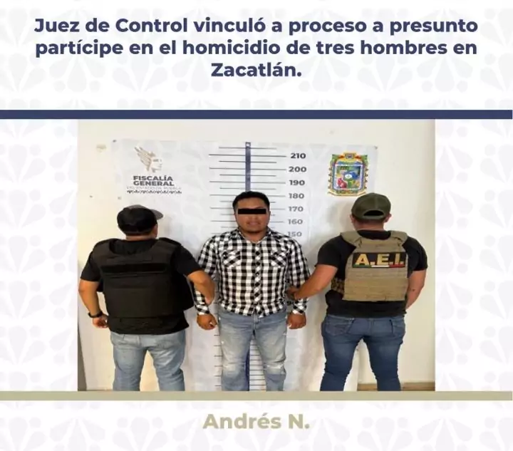 La Fiscalía General del Estado de Puebla informa que derivado de los actos de investigación realizados en torno a un evento de privación de la vida de tres personas en el municipio de Zacatlán, se obtuvo la vinculación a proceso de Andrés N., señalado como probable partícipe en los hechos.