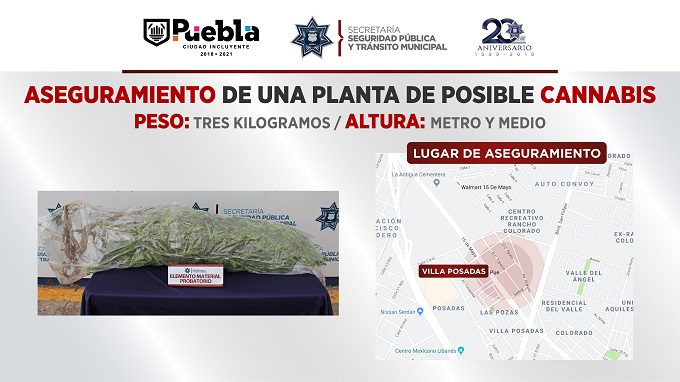 En atención a un reporte ciudadano vía número de emergencias 9-1-1, la Secretaría de Seguridad Pública y Tránsito Municipal (SSPTM) de Puebla ubicó y aseguró en la colonia Villa Posadas un ejemplar botánico con características similares al cannabis.