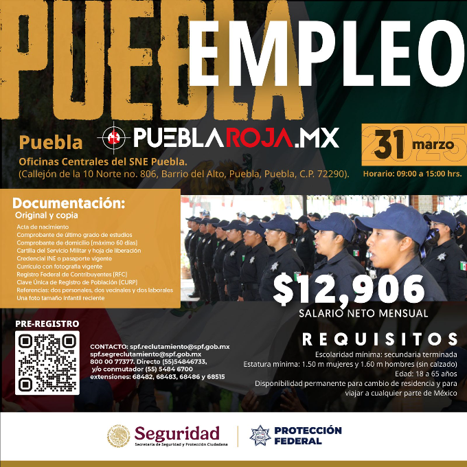 El personal de reclutamiento del SPF estará el 31 de marzo, en un horario de 09:00 a 15:00 horas en el Servicio Nacional de Empleo en Puebla, ubicado en Callejón de la 10 norte 806, Barrio El Alto, Puebla, Puebla.
