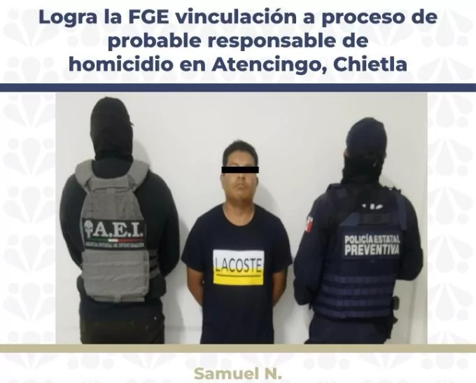 La Fiscalía General del Estado de Puebla obtuvo la vinculación a proceso de Samuel N., señalado como probable responsable del delito de homicidio calificado en agravio de un hombre, en la localidad de Atencingo, perteneciente a Chietla, Puebla.