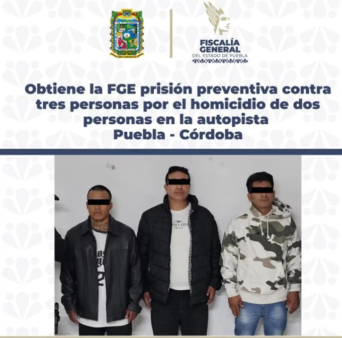 La Fiscalía General del Estado de Puebla informa que formuló imputación y obtuvo prisión preventiva en contra de Darinel N., José N. y Marco Antonio N., detenidos por su presunta participación en la privación de la vida de dos personas, ocurrido el pasado 5 de agosto, sobre la autopista Puebla – Córdoba.