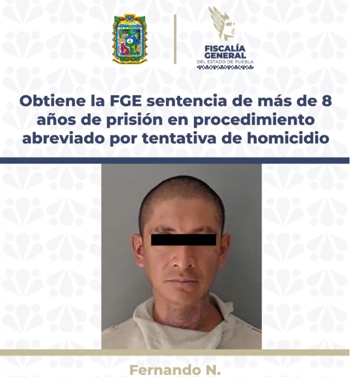 La Fiscalía General del Estado de Puebla informa que se obtuvo sentencia condenatoria de más de 8 años de prisión, dictada mediante procedimiento abreviado, en contra de Fernando N., al acreditarse su plena responsabilidad penal en la comisión del delito de homicidio calificado en grado de tentativa.