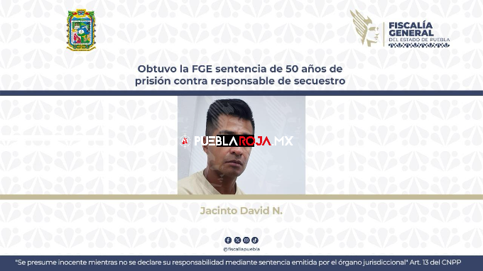 La Fiscalía General del Estado obtuvo una sentencia de 50 años de prisión en contra de Jacinto David N., al acreditar con el caudal probatorio su responsabilidad en el delito de secuestro agravado, ocurrido en el municipio de Venustiano Carranza, cometido en agravio del propietario de un hotel.