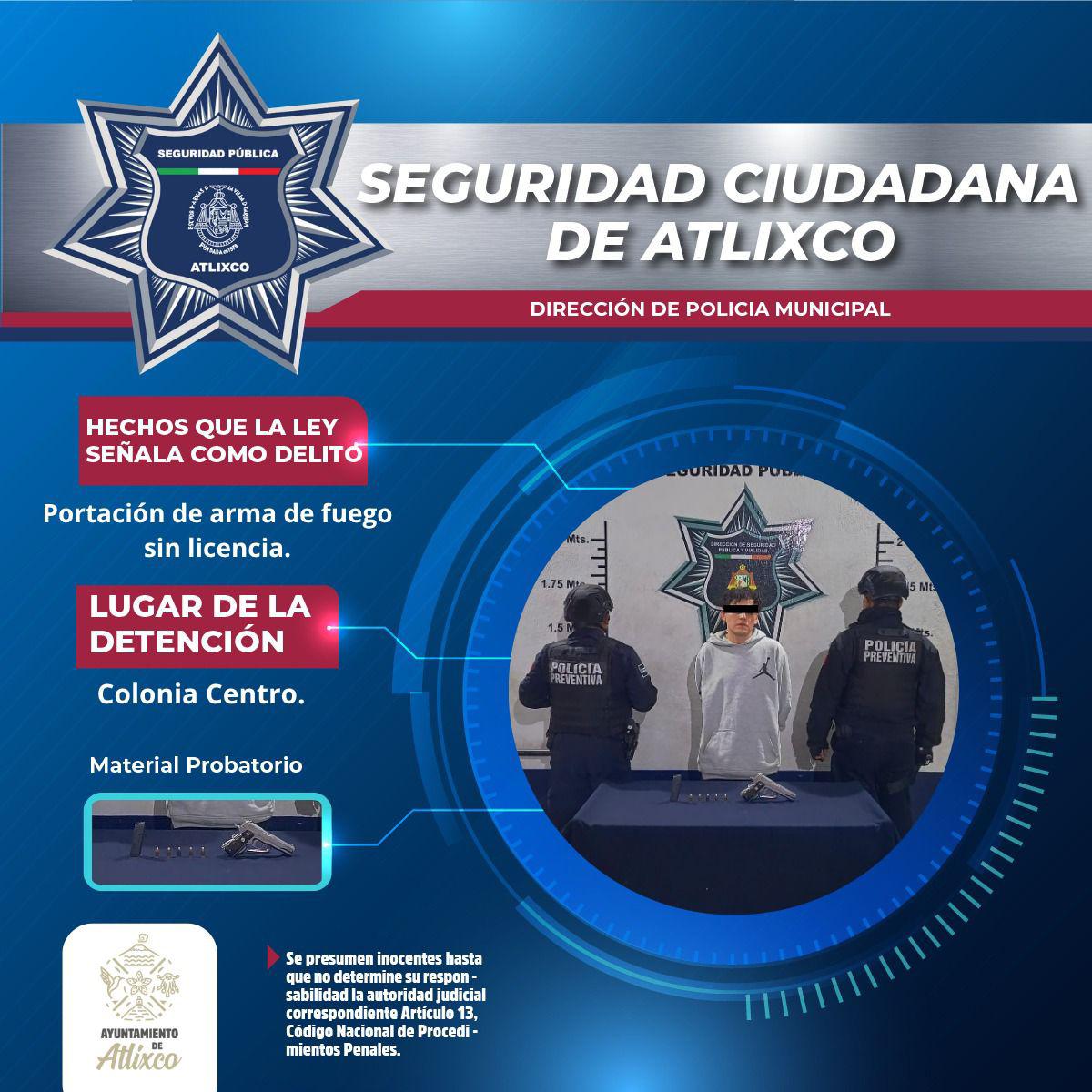 Durante un operativo preventivo realizado en el primer cuadro de la ciudad, elementos de la Secretaría de Seguridad Ciudadana de Atlixco lograron la detención de un individuo en posesión de un arma de fuego sin licencia.