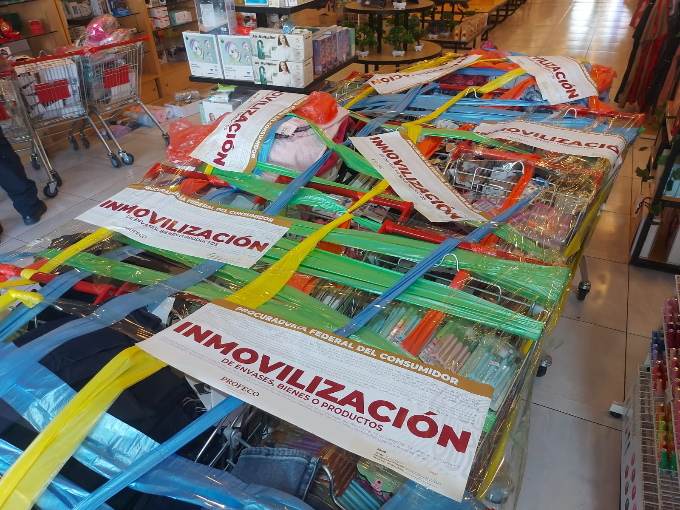 Derivado de la supervisión, se encontró que el lugar no cumplía con la LFPC ni con las Normas, por lo que se inmovilizaron 4 mil 551 productos y se colocaron siete sellos de suspensión comercial.