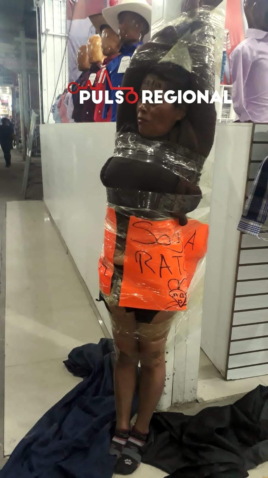 Una mujer de aproximadamente 45 años de edad, fue acusada de ser ladrona en el tianguis de San Martín Texmelucan. Los comerciantes la capturaron y la exhibieron, la amarraron con cinta adhesiva a un tubo de uno de los locales y le colocaron dos cartulinas donde previamente habían escrito “Soy Rata”.