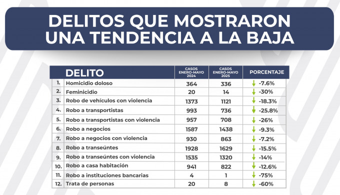 Durante los primeros cinco meses de este año se redujeron 12 delitos de impacto social en el estado de Puebla, en comparación con el mismo periodo del año pasado.