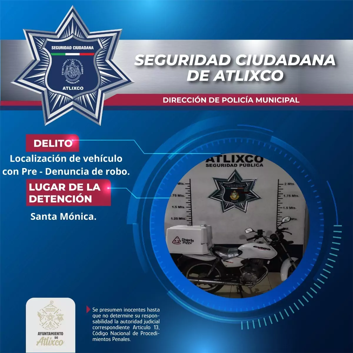 Elementos de la Secretaría de Seguridad Ciudadana de Atlixco localizaron una motocicleta con reporte de robo durante un recorrido de vigilancia en la colonia Guadalupe.