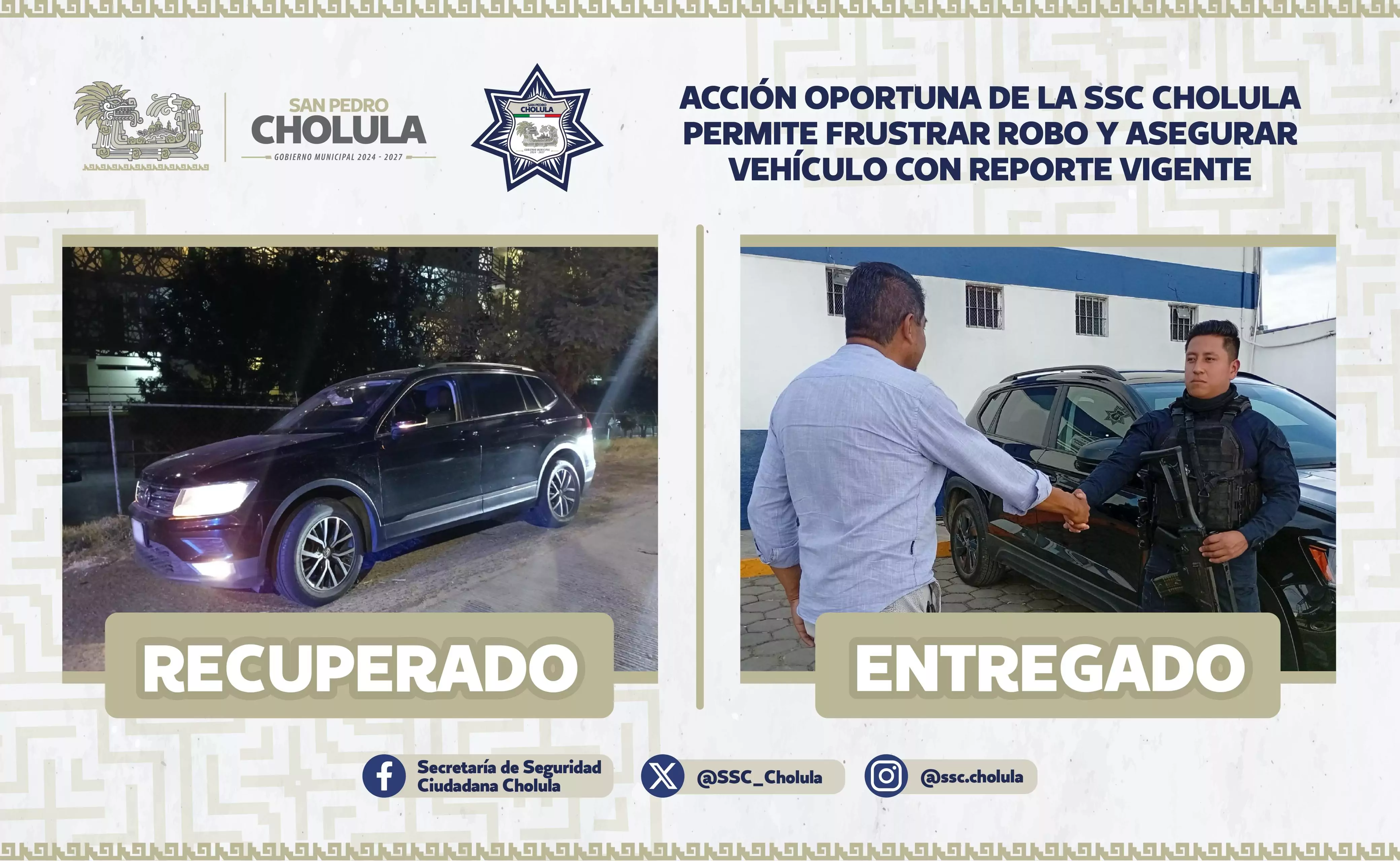 16 de enero, 2026. San Pedro Cholula, Pue. – Derivado de la atención inmediata a un reporte ciudadano, elementos de la Secretaría de Seguridad Ciudadana de San Pedro Cholula (SSC Cholula) frustraron el robo de una camioneta y lograron el aseguramiento de otra unidad con reporte vigente en el Registro Público Vehicular (REPUVE).