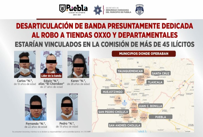 Derivado de la conjugación de labores de inteligencia y operatividad policial en combate a la delincuencia, el Ayuntamiento de Puebla que encabeza la Alcaldesa, Claudia Rivera Vivanco, a través de la Secretaría de Seguridad Ciudadana (SSC) del Municipio anunció la desarticulación de una banda delictiva, conformada por cinco personas, presuntamente dedicada al robo de tiendas de conveniencia y departamentales.