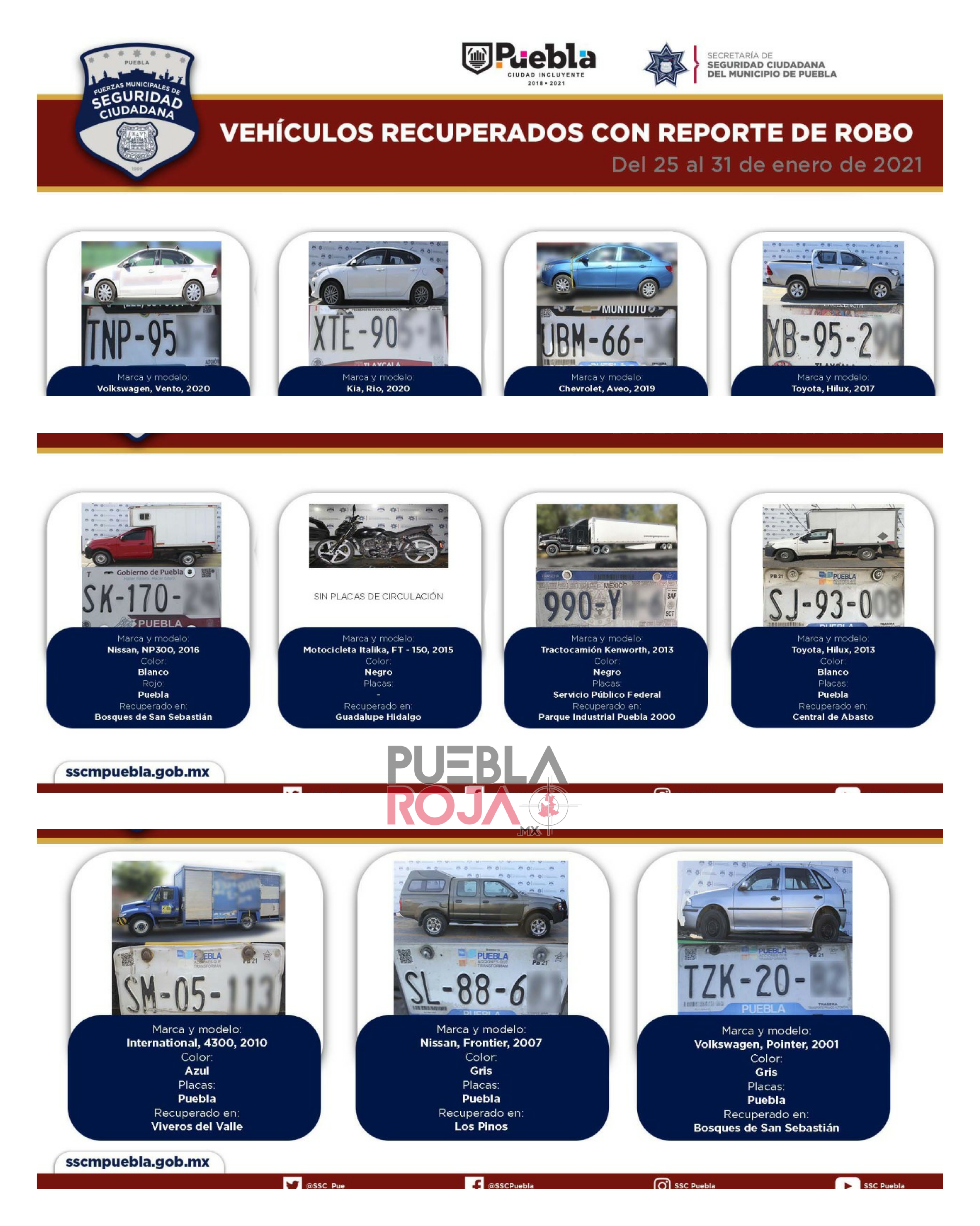 Como resultado del robustecimiento de diversas acciones en materia de prevención del delito, el Gobierno de la Ciudad de Puebla que encabeza la Alcaldesa, Claudia Rivera Vivanco, a través de la Secretaría de Seguridad Ciudadana (SSC) del Municipio reportó la recuperación de 11 vehículos con reporte de robo, en el periodo comprendido del 25 al 31 de enero de enero del presente año.