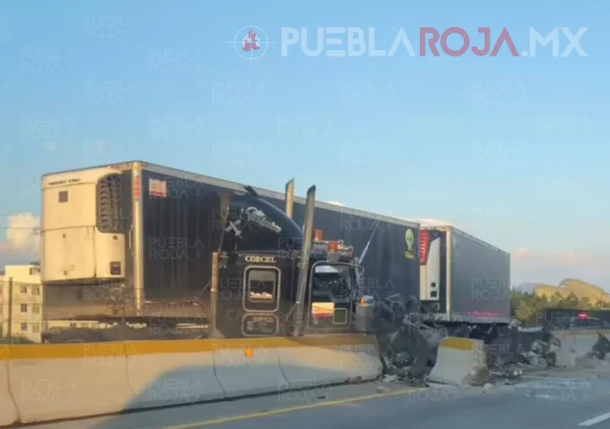 Dos tractocamiones se impactan por alcance y se estrellan contra muro de contención la tarde de este domingo sobre la autopista Puebla – Orizaba antes de llegar a la caseta de Amozoc a la altura del kilómetro 142, sentido a Puebla.