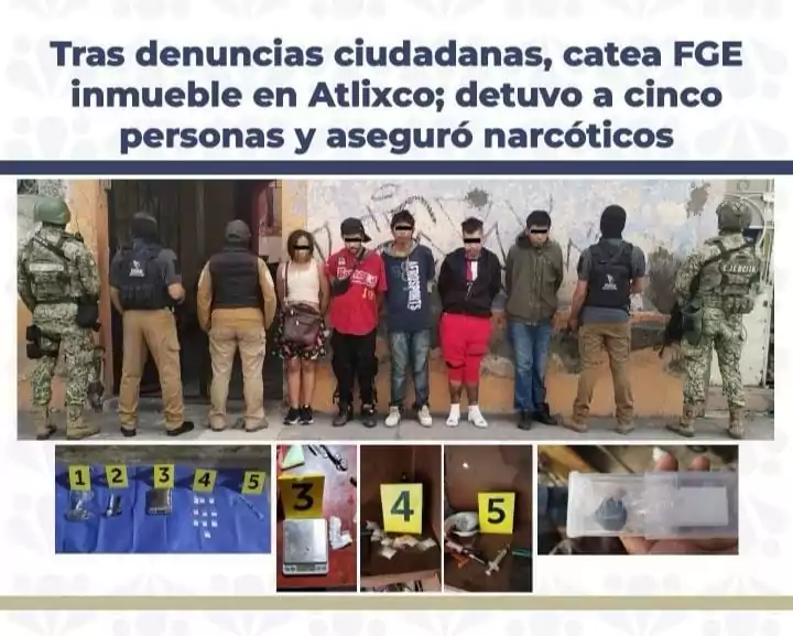 En cumplimiento a una orden girada por el Juez de Control, la Fiscalía General del Estado cateó un inmueble en el municipio de Atlixco, logrando el aseguramiento de múltiples dosis de droga y la detención de cinco persona presuntamente vinculada a actividades de narcomenudeo.
