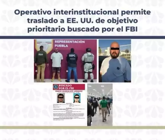 Como resultado de una operación derivada de la detención en el estado de Puebla por parte de la Policía Estatal de un hombre identificado como Mario Guadalupe N., en posesión de estupefacientes, la Secretaría de Seguridad y Protección Ciudadana (SSPC), el Instituto Nacional de Migración (INM) y la Fiscalía General del Estado de Puebla (FGE), concretaron su traslado a Estados Unidos, luego de que se corroboró que era un objetivo prioritario requerido por el Federal Bureau of Investigation (FBI).