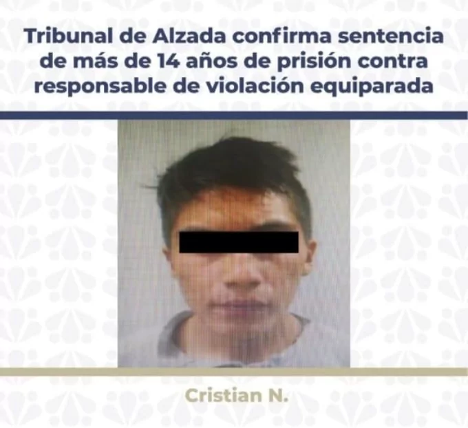El Tribunal de Alzada confirmó la sentencia de más de 14 años de prisión dictada contra Cristian N., por su responsabilidad penal en el delito de violación equiparada, con base en los argumentos presentados por la Fiscalía General del Estado.
