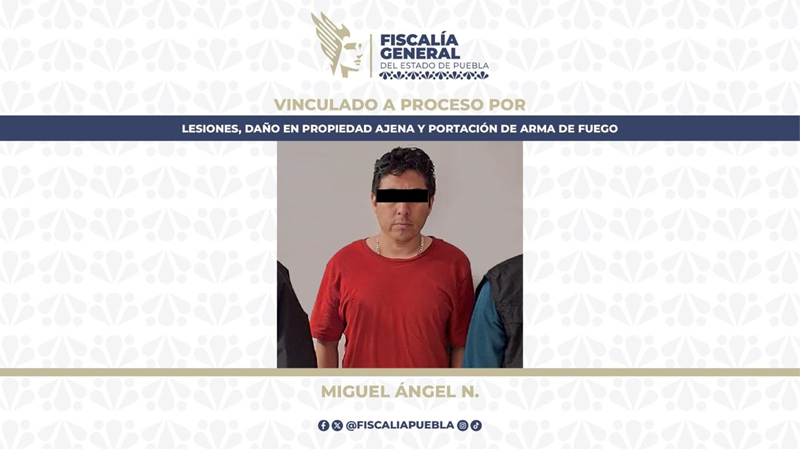 Mediante la aportación de datos de prueba, la Fiscalía General del Estado de Puebla obtuvo la vinculación a proceso de Miguel Ángel N., bajo cargos por lesiones, daño en propiedad ajena a título de culpa y portación de arma de fuego sin licencia.